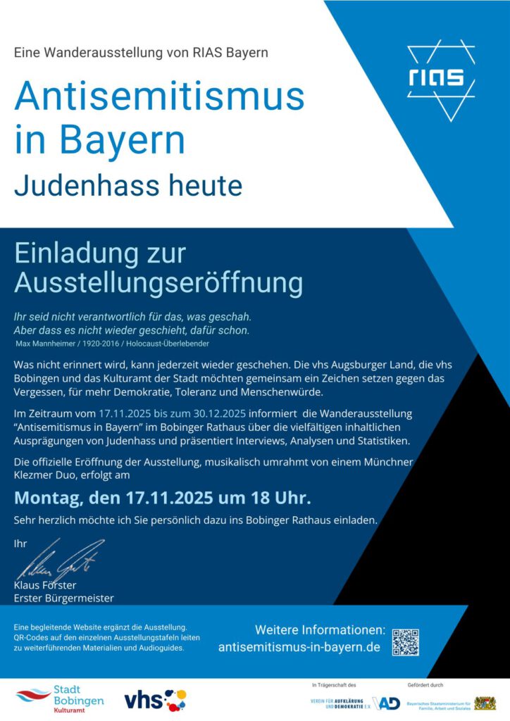 Am 27. Januar jährt sich der Tag der Befreiung des Konzentrationslagers Auschwitz zum 80. Mal. In Erinnerung an diesen Tag laden das Kulturamt der Stadt Bobingen und der Verein Bobingen ist bunt e.V. zu einem Histörchen im Runden Saal des Unteren Schlößchens ein. Reinhold Lenski und Sandra Hartl, Kulturamtsleiterin, lesen in Ausschnitten aus den Lebensberichten und Zeitzeugeninterviews des Pfarrers Friedrich Schafranek.