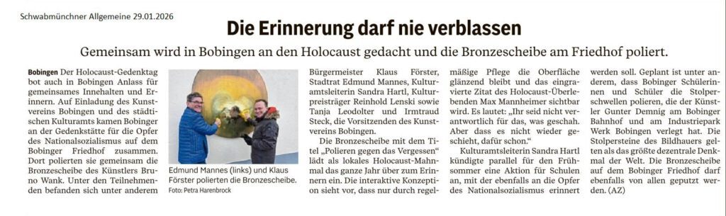 Der Verein Bobingen ist bunt e. V. hat zum Gedenken an diesen Tag, heute am 26. Januar 2024, die im März 2023 vor dem Haupteingang der IWB verlegte Stolperschwelle gereinigt.